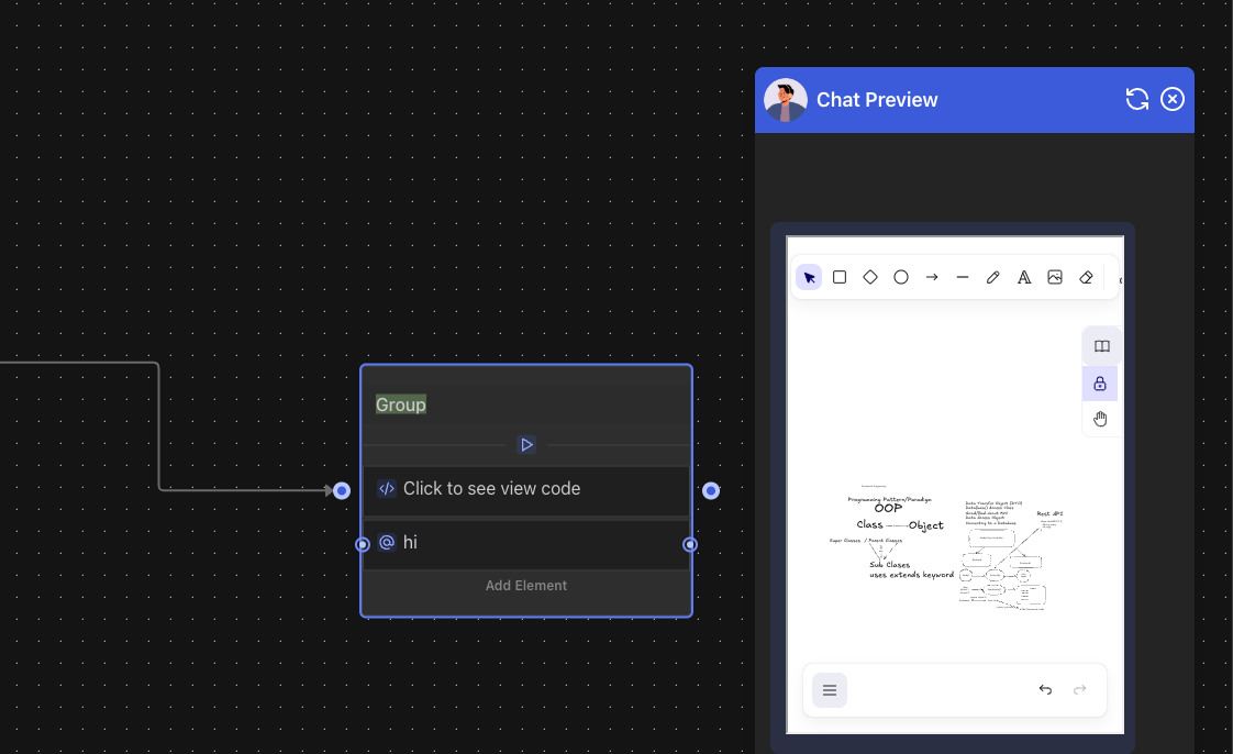 The Embed Bubble element allows you to embed external content like websites, videos, or other HTML content into your chat flow. The element takes an iframe code or URL input and displays it inline within the chat.